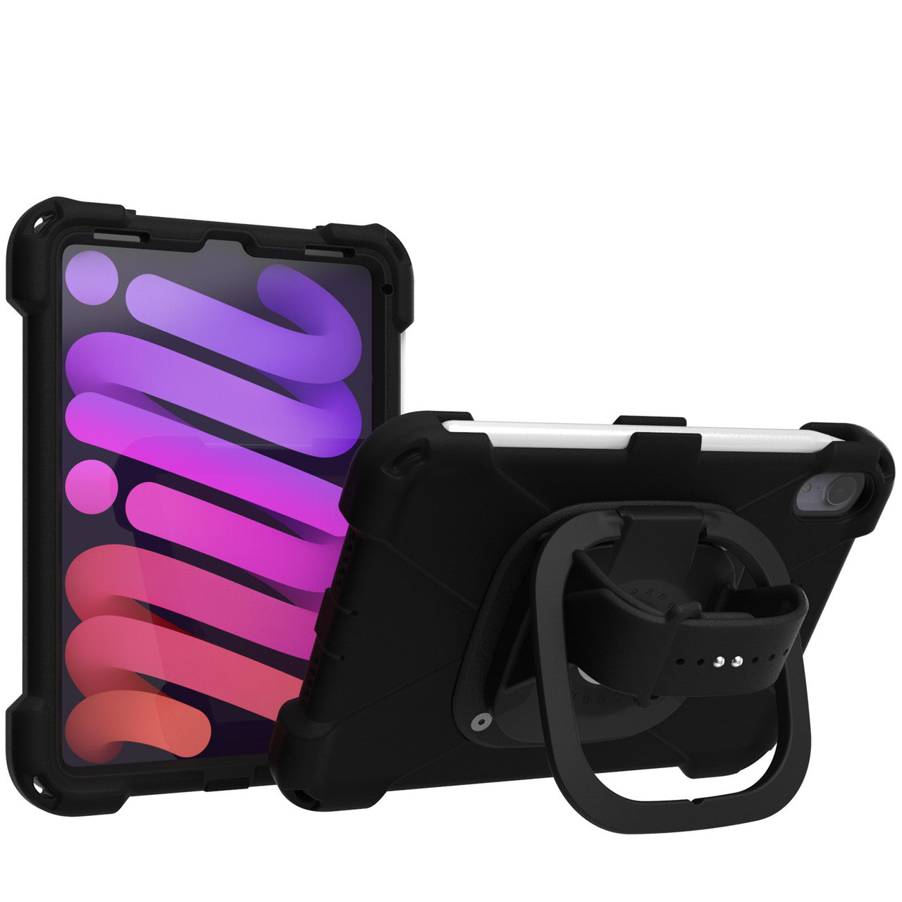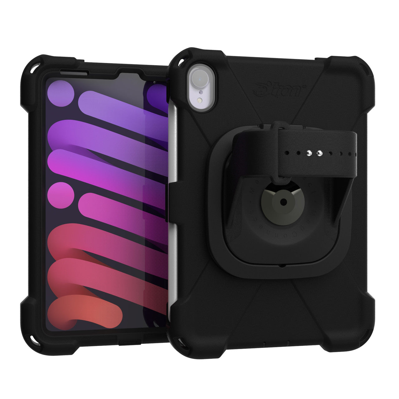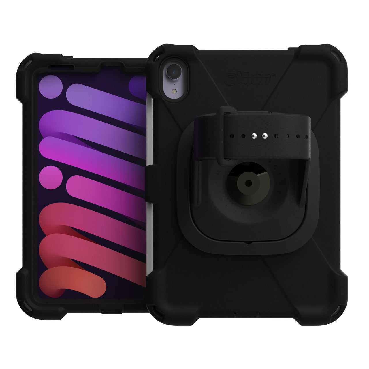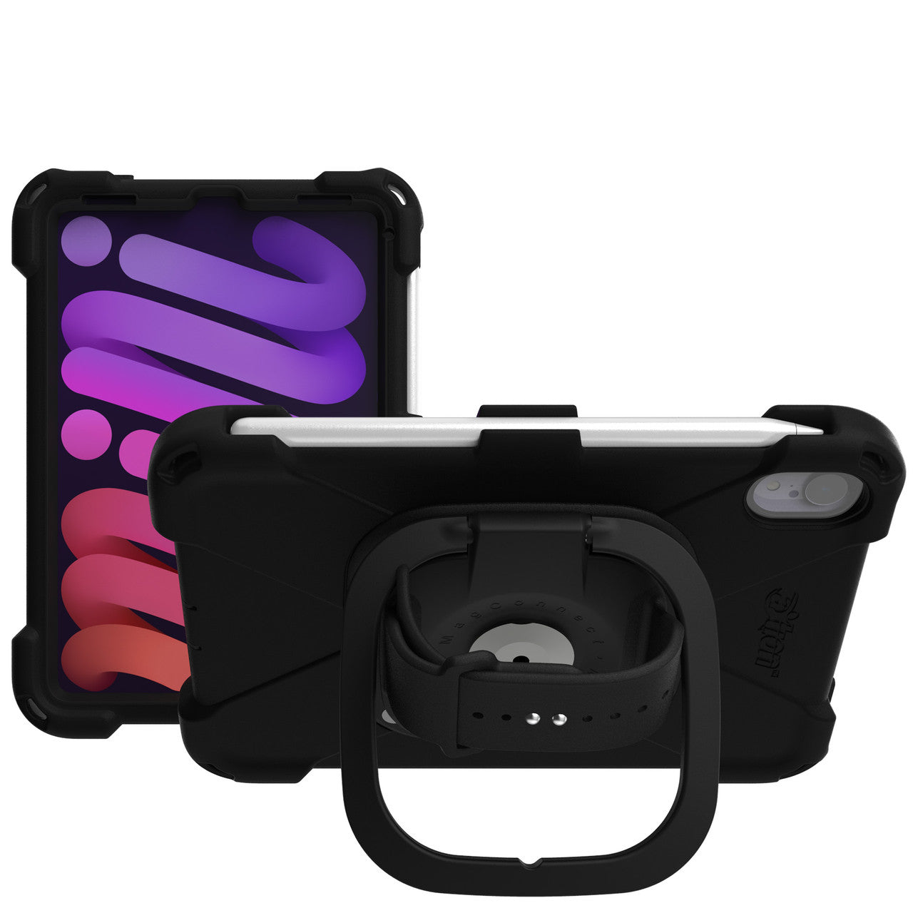 The Joy Factory aXtion Bold MP for iPad mini (A17 Pro) | 6th generation is a military grade certified drop proof case that boasts MIL-STD-810H certification. Other protective features include: screen and camera lens protectors to prevent scratches to the device; molded-in button and port covers to reduce exposure to foreign debris; and reinforced corners to help absorb shock if dropped. In addition to these protective features, the case features an MP+ module which includes: a rotating/adjustable hand strap that is made of silicone for easy cleaning; and a multi-angle kickstand that doubles as a carrying handle.